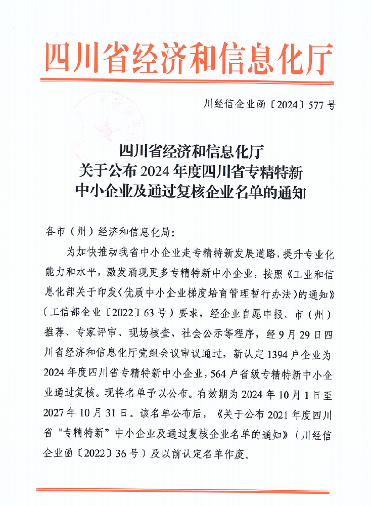 近日,四川省經濟和信息化廳公布了2024年專精特新中小企業名單,四川艾能捷科技有限公司(Sichuan Energy Technology Co., Ltd.)憑借其卓越的技術實力和專業化發展優勢,榮獲四川省“專精特新”中小企業稱號。這一成就體現了艾能捷(ENERGY)公司在技術創新和專業服務方面的卓越表現,也符合“...